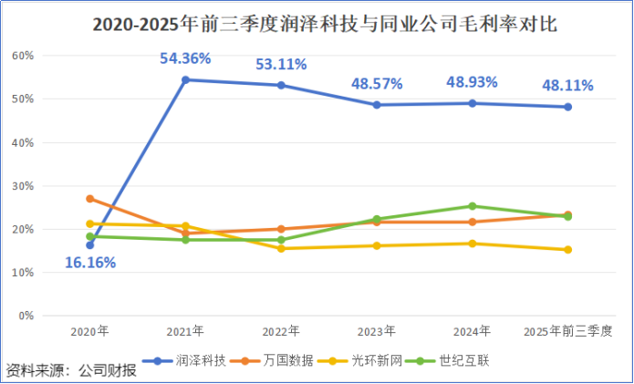 2021-2025年前三季度,公司的毛利率一直维持在50%左右,远超万国数据、光环新网等同行业公司。