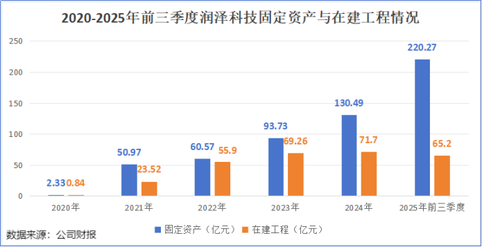 截至2025年三季度末,公司的固定资产与在建工程合计达到285.47亿元,较年初增加了83.28亿元。